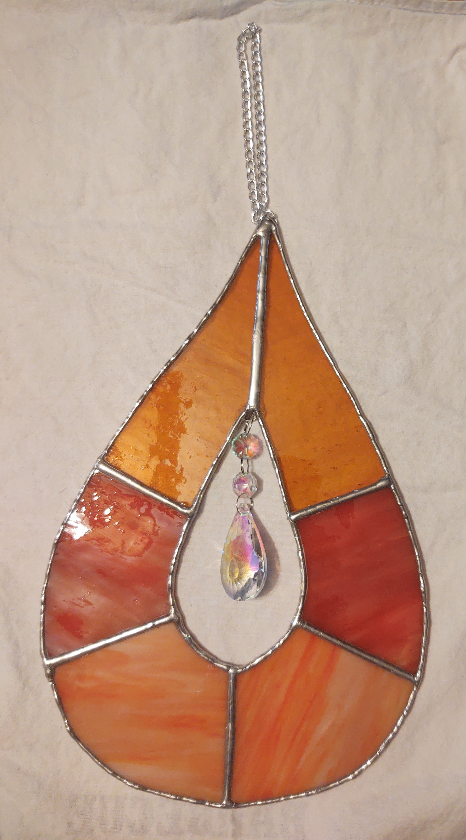 Made with different colored stained glass, copper foil, solder and crystal chain hanging in middle.